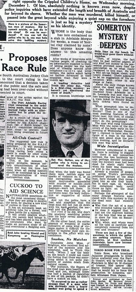 About the only things known about the dead man are that the day before he died he travelled to Adelaide on a St. Leonards bus and that before boarding the bus he bought a train ticket to Henley Beach. Both tickets were found on him.